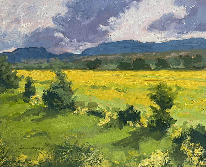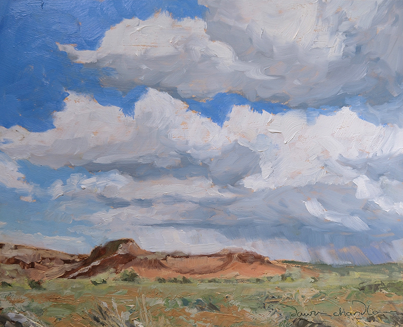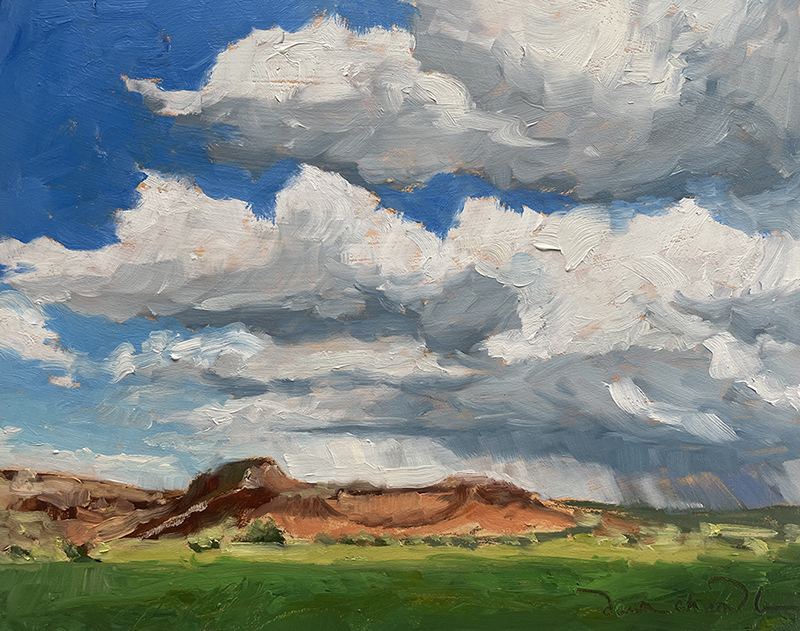 a rolling spring rain taunts pedernal – oil painting at ghost ranch
